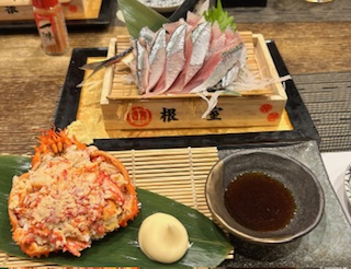 根室でカニと秋刀魚 2025年10月9日 昼間は学生さんとしてお勉強! 夜になったら、ただのオッサンに戻って根室の食を楽しみましたよ♬ なにしろ根室の花咲漁協は秋刀魚と花咲蟹の水揚げで有名ですよね! 甲羅にびっしり詰まったカニの身!根室では秋刀魚のお刺身は、ネギと一味唐辛子で食べるんですよ。 これがお酒に合って、最高〜〜♬ 春風亭昇太