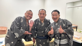 夏季研修会! 2025年10月12日 これも、少し前の夏の話になってしまいましたが、公益社団法人「落語芸術協会」の夏季研修会がありました。 いつものように、まずは浅草の本法寺さんで「噺塚」の法要をした後に場所を移して夏季研修ですね。 今年は浴衣を新しくしたんですがデザインは若手の皆さんにお願いしました。色もデザインも、今までとは違って面白いものになりましたよ。 参加していた、座布団を取り合う番組の先輩と後輩とパチリ♬ 春風亭昇太